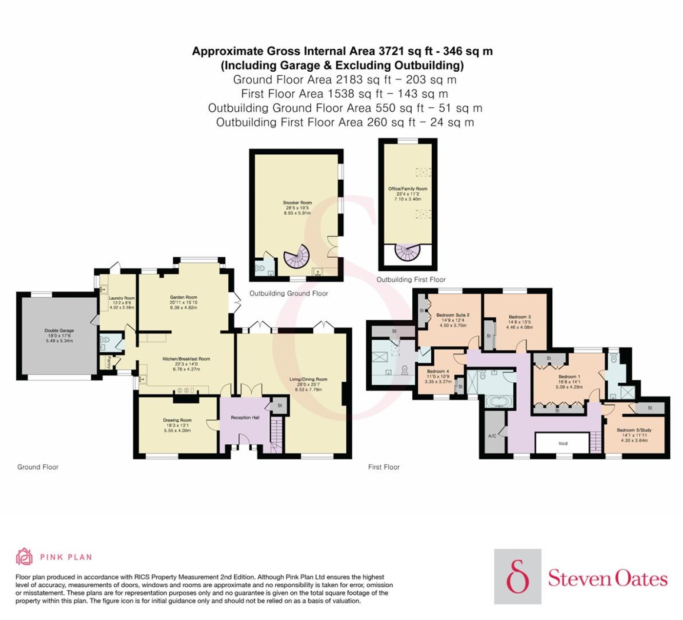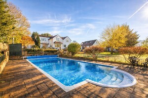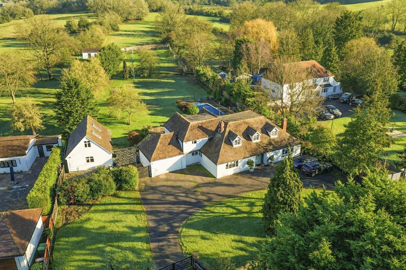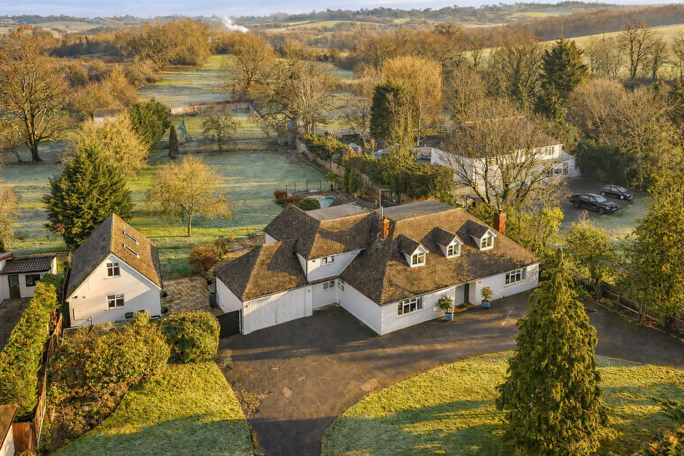 Upstairs, a galleried landing leads to five bedrooms and a modern family bath/shower room. The principal bedroom benefits from fitted wardrobes, a new en-suite shower room and garden views, while the second bedroom also features fitted wardrobes and a new en-suite. Externally, the property is approached via electric gates leading to a carriage driveway with parking for several vehicles. The beautiful rear garden offers an expansive patio, sunken swimming pool, and a substantial detached annexe/games room with further room above, offering excellent potential for self-contained accommodation (subject to planning). The secluded plot extends to approximately 1.25 acres, enjoying open views towards Nazeing Common and surrounding countryside.