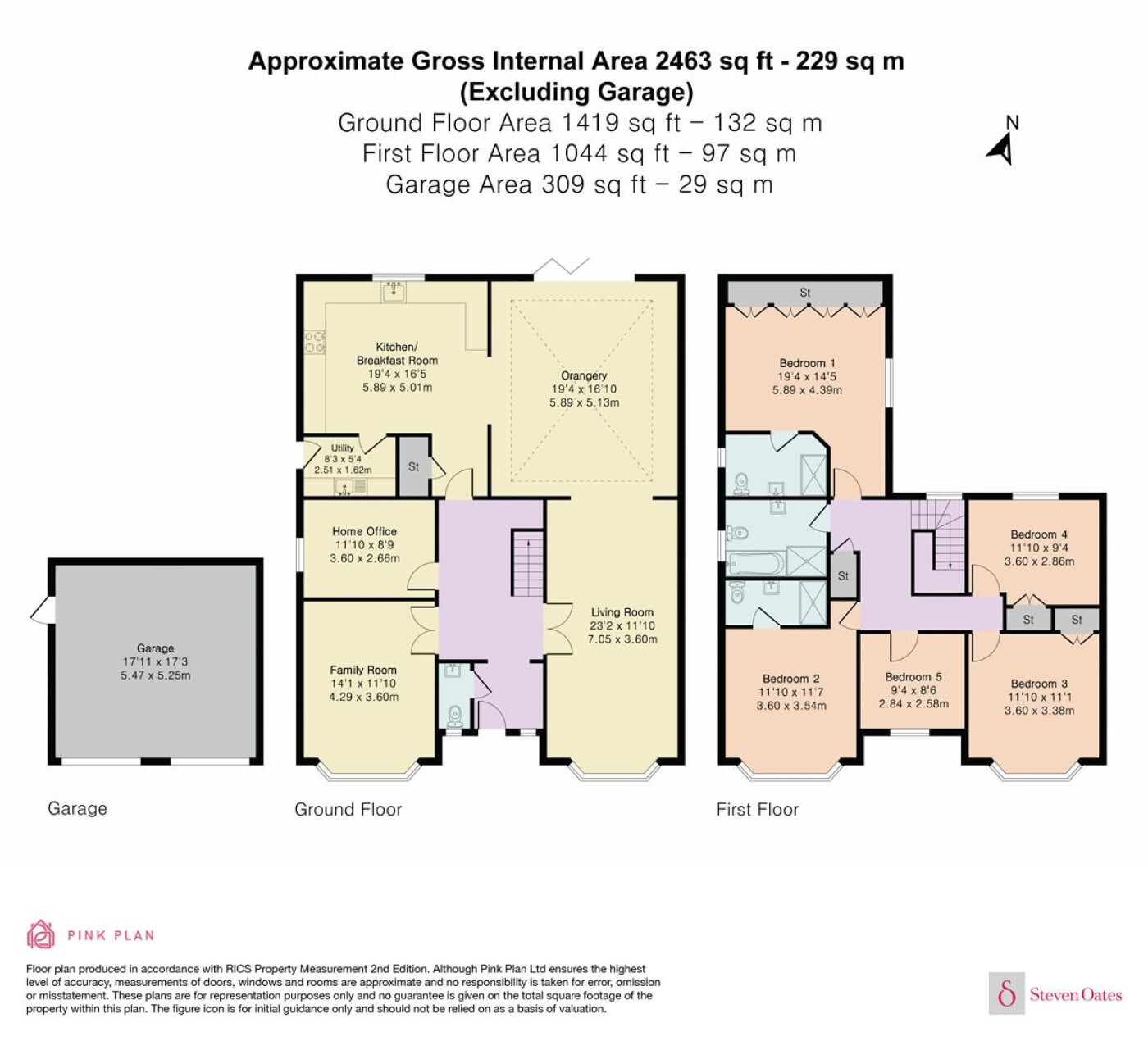 A substantial five-bedroom, three-bathroom detached residence offering just under 2,500 sq ft of versatile accommodation arranged over two floors. Tucked away within a private gated development, this impressive family home has been thoughtfully maintained and tastefully enhanced by the current owners. A bright and airy entrance hall leads to a sitting room, a study, and a generous lounge that opens into the beautiful orangery, which in turn connects seamlessly to the kitchen. The orangery features bi-fold doors leading out to the rear garden, creating an excellent space for both everyday living and entertaining. A utility room and downstairs cloakroom complete the ground floor. Upstairs, the stunning galleried landing provides access to five double bedrooms and the family bathroom. The 19ft principal bedroom benefits from fitted wardrobes and an en-suite shower room, while the second bedroom also enjoys its own en-suite. Externally, the property offers off-street parking for several cars, a double garage with power and lighting and a mature rear garden that is both private and secluded.