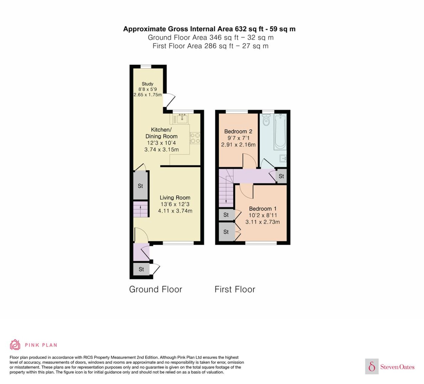 Steven Oates are delighted to offer this two bedroom extended mid terrace house nestled in the tranquil cul-de-sac of Turpins Close. The property is arranged over two levels and comprises of an entrance leading to lounge and first floor landing, kitchen/diner and a study area currently being used as a play room. On the first floor, there are two bedrooms and a family bathroom. Externally, there is allocated parking with ample visitors parking and a landscaped private garden. Ideal purchase for investment or first time buyer.